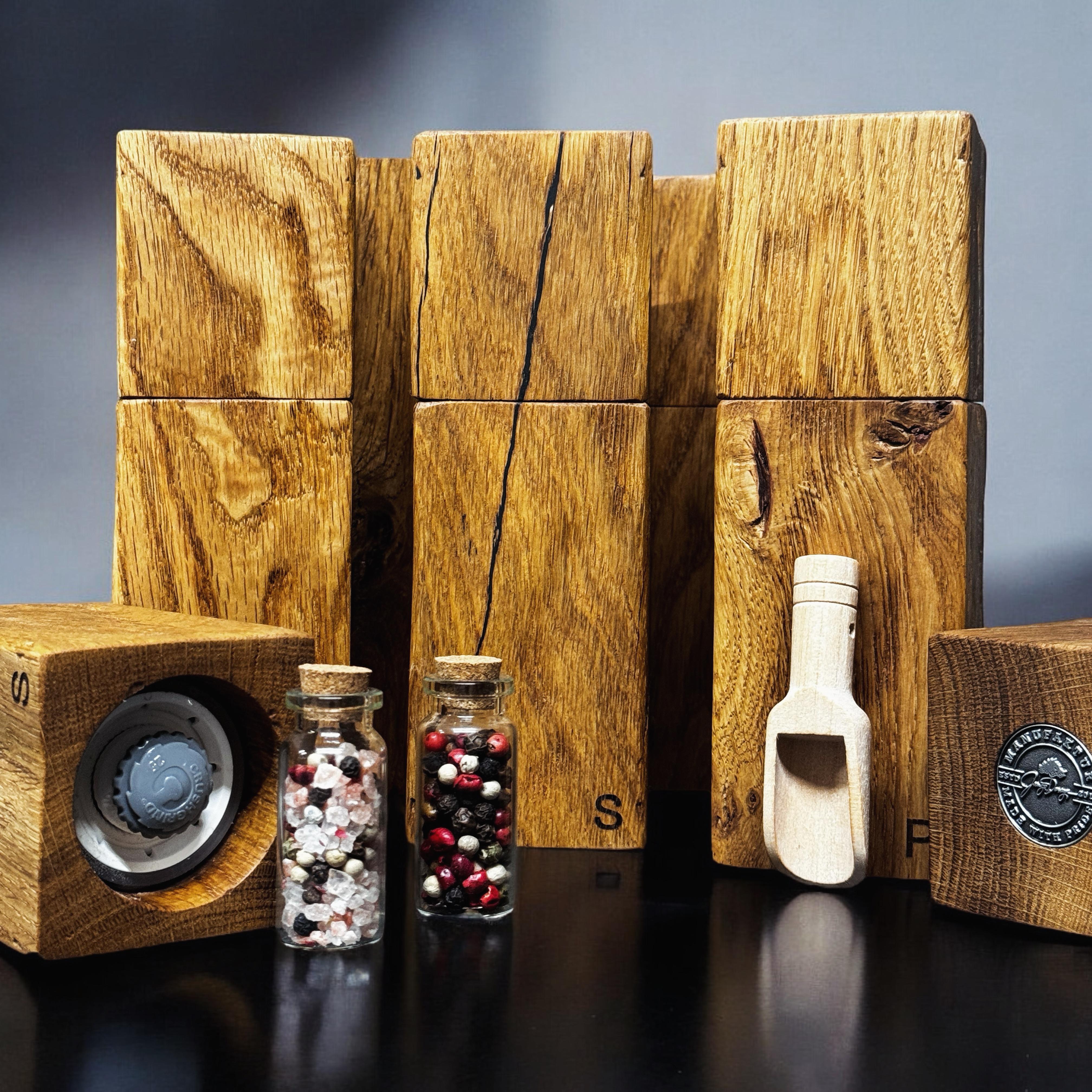 Discover the perfect combination of functionality and elegance: This handcrafted pepper and salt mill made of brushed oak is not only a practical kitchen tool, but also a stylish design object for the table and kitchen.